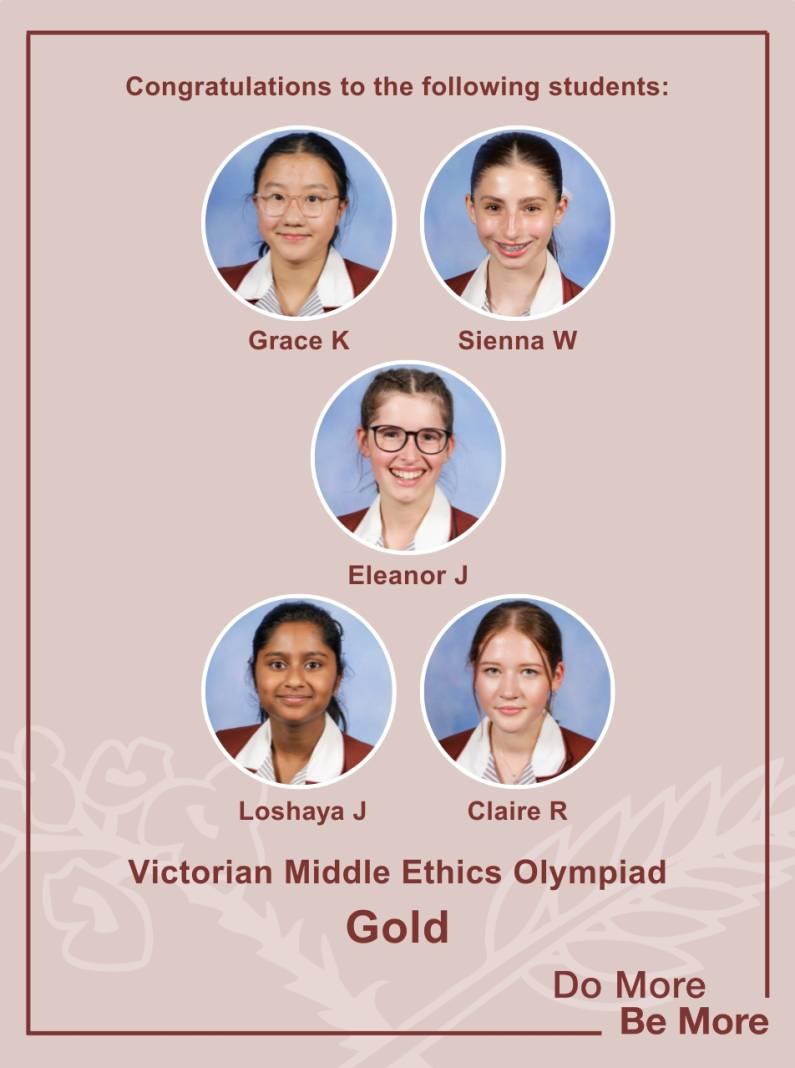 Congratulations to Grace K and Sienna W (Year 7), Eleanor J (Year 8), and Loshaya J and Claire R (Year 9), who won gold after competing in the Victorian Middle Ethics Olympiad against over twenty teams from thirteen schools across the state. Competing via Zoom, the students participated in four heats throughout the full-day event, working together to broaden their perspectives, engage in respectfu...