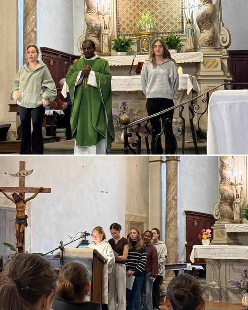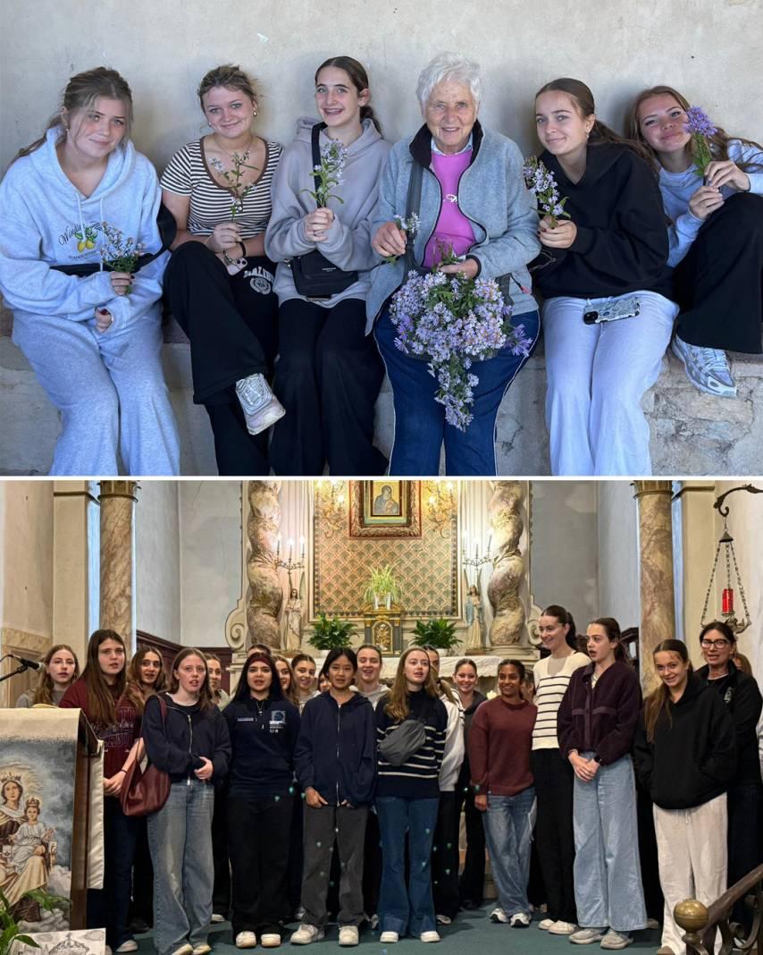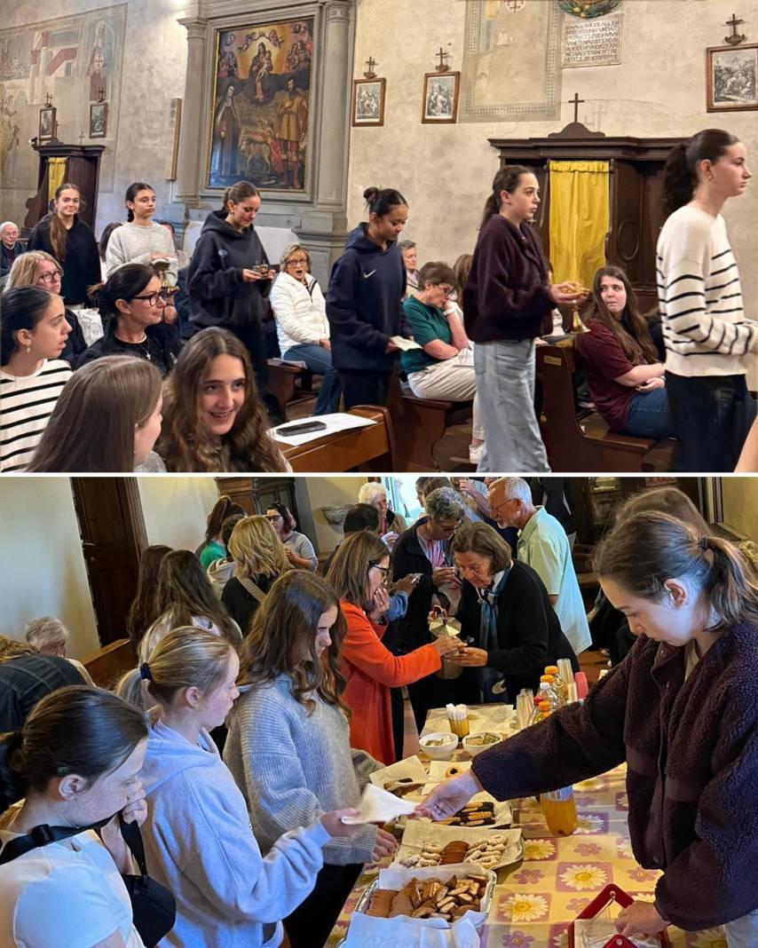 "This morning, we attended Mass at the Monastery which was well attended, and we concluded by singing the Hymn to St Catherine. As a gesture of gratitude for the Tavarnelle community’s generous support, we presented a tablecloth and canvas created by Charlotte, Caitlin and Juliette.”
