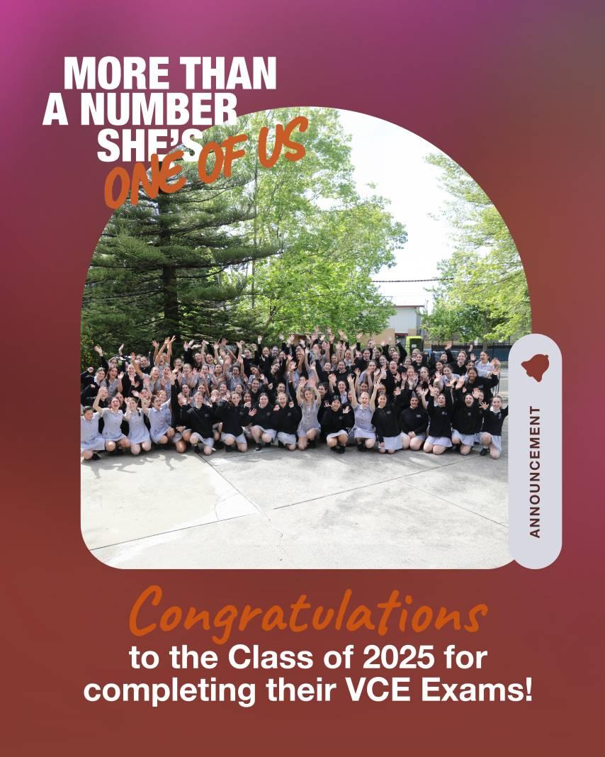 Congratulations to the Class of 2025 on completing your VCE examinations today! We are immensely proud of your dedication and resilience. We encourage you to take this well-earned break to rest, recharge and reflect on your achievements. In time, we look forward to witnessing the remarkable contributions you will make beyond the Siena gates.
