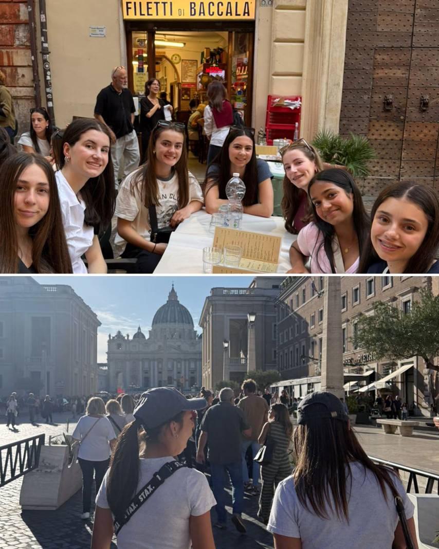 "We woke up and had breakfast, ready for our first full day in Italy. In the morning, we went shopping in small groups and enjoyed a delicious panini for lunch. Next, we crossed the Ponte Bridge toward Vatican City. Once there, we toured the Vatican Museums and visited the Sistine Chapel. We also participated in the Jubilee Pilgrimage Walk through St Peter’s Square, exploring St Peter’s Basilica and admiring the church’s stunning architecture and intricate details.