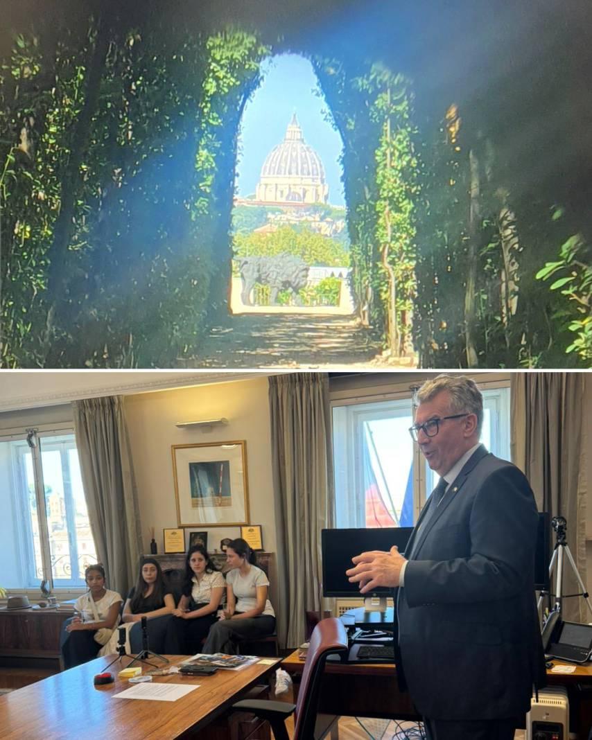 "On our last day in Rome, we got up bright and early to prepare for our departure. We spent the morning packing and had breakfast at the hotel before loading our bags into the vans. Our first stop was a meeting with the Ambassador to the Holy See, which was a wonderful and inspiring opportunity. We then visited the beautiful Santa Sabina Church, followed by the Piazza dei Cavalieri di Malta. From there, we admired the famous keyhole view where you can see the territories of Malta, Italy and Vatican City all at once.