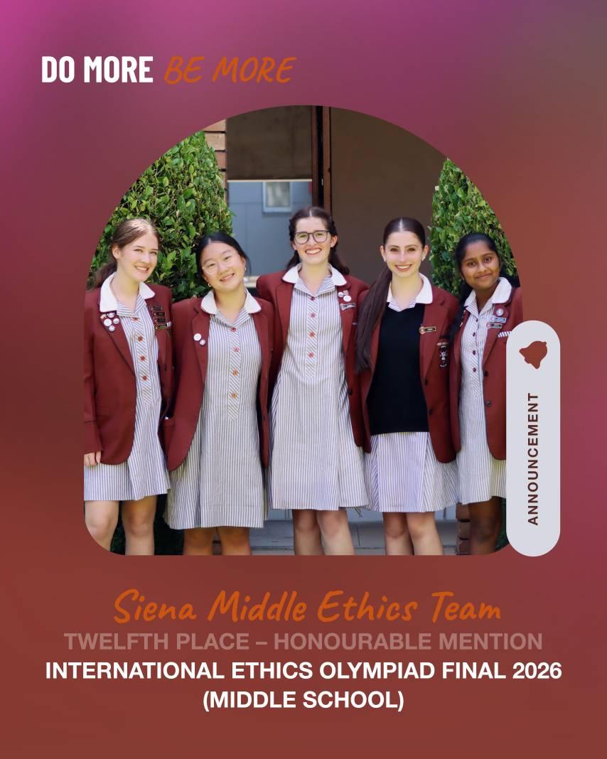 After winning Gold at the 2025 Victorian Middle Ethics Olympiad, the Siena Middle Ethics team comprising Grace K and Sienna W (Year 8), Eleanor J (Year 9), as well as Loshaya J and Claire R (Year 10) went on to represent the College at the International Final. Students took part in three challenging heats, competing against fifty top schools from around the world via Zoom.