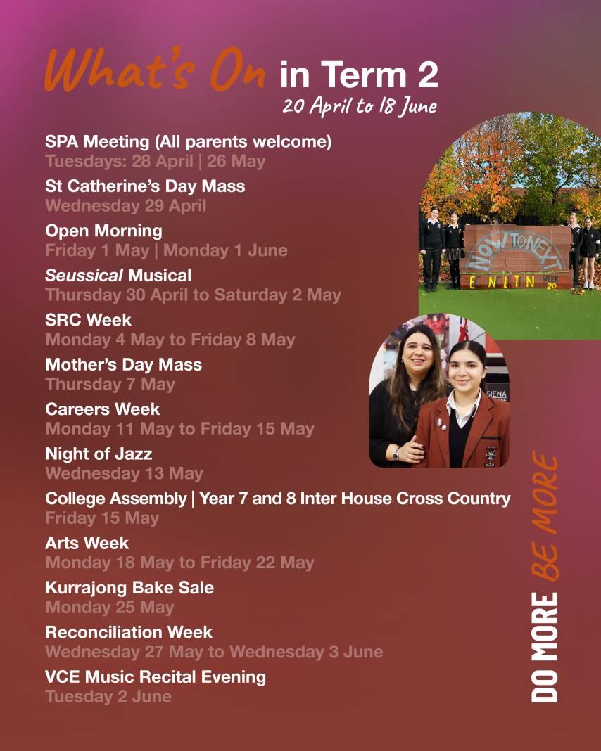 As Term 2 progresses, we are pleased to share some of the College events scheduled for the coming weeks. For further details, please visit the College calendar and keep an eye on Siena Central for the latest updates.
