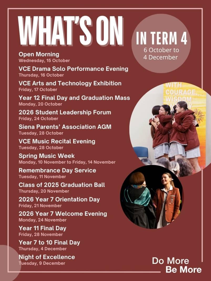 As Term 4 progresses, we are pleased to share some of the exciting events scheduled for the coming weeks. For further details, please refer to our College Calendar and keep an eye out on Siena Central.